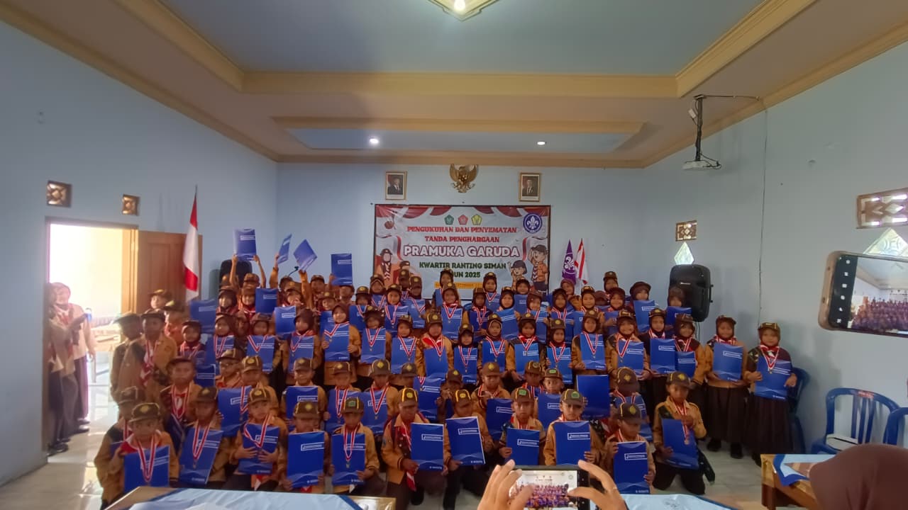 Para peserta yang dikukuhkan tampak antusias dan penuh semangat. Mereka menerima tanda penghargaan berupa lencana Pramuka Garuda yang disematkan langsung oleh jajaran pengurus Kwarran Siman.